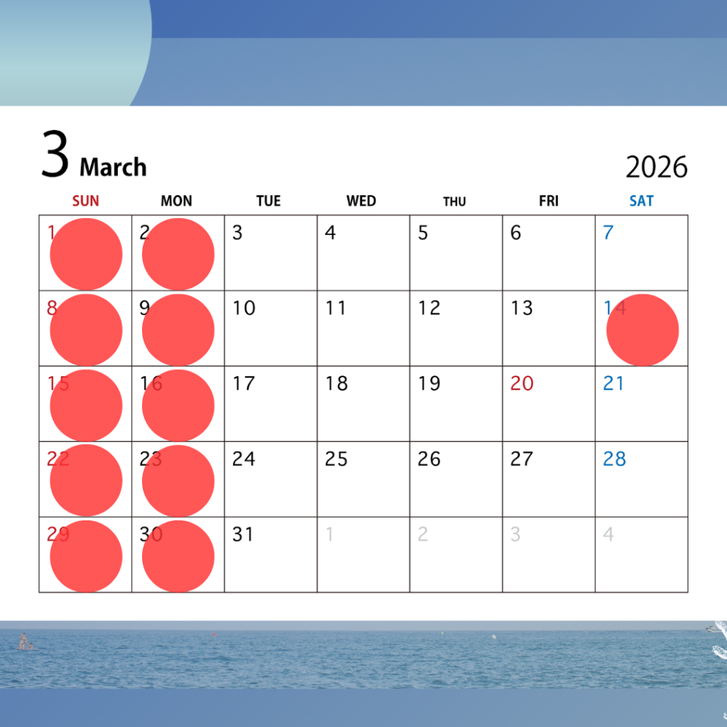 3月の定休日 毎週日曜・月曜・14日(土)